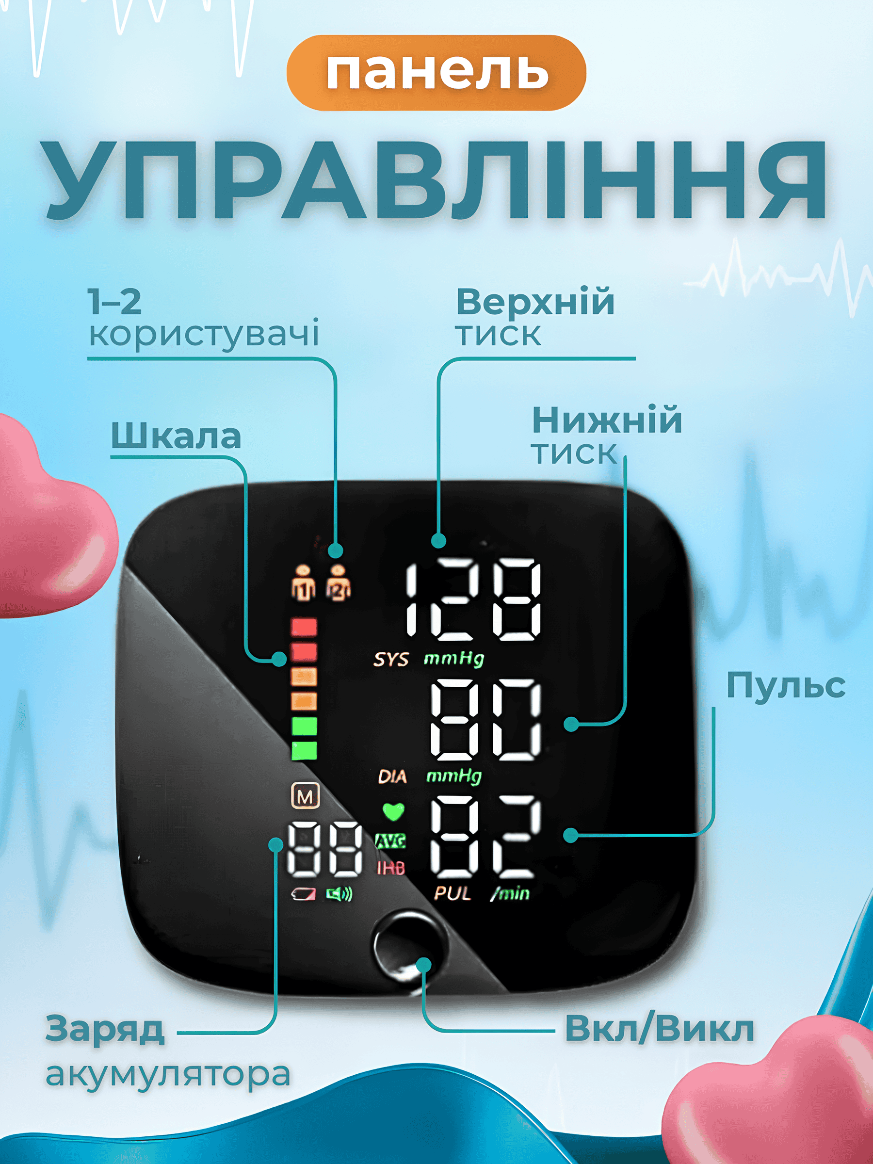 На екрані відображаються верхній і нижній тиск, пульс та заряд