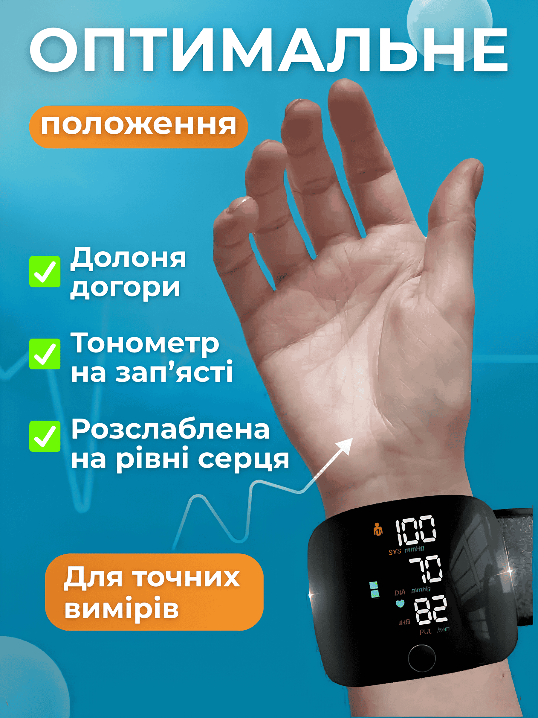 тонометр на зап’ясті, а руку розслабленою на рівні серця. Завдяки правильно підібраній універсальній